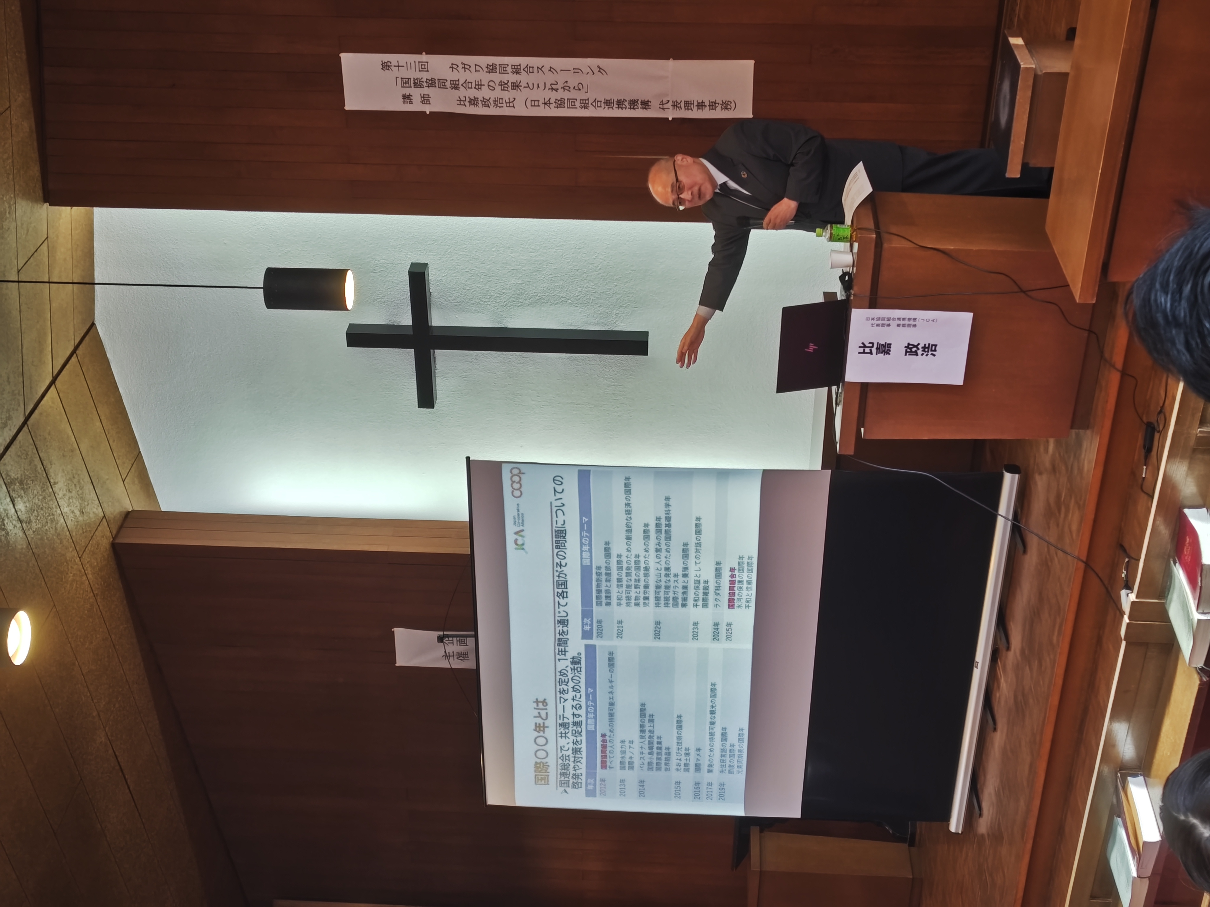 午前は当財団の石部理事長から「賀川豊彦の協同組合思想」というテーマで講演があり、その後JCA(日本協同組合連携機構)の比嘉代表理事専務から「国際協同組合年の成果とこれから」というテーマで講演がありました。比嘉代表理事専務の講演では、組合員のニーズと願いを実現して社会や地域の課題解決に貢献してきたこれまでの協同組合の実践事例と、それに伴う国連の協同組合への信頼や期待について、分かりやすくユーモアを交えて解説をしていただきました。