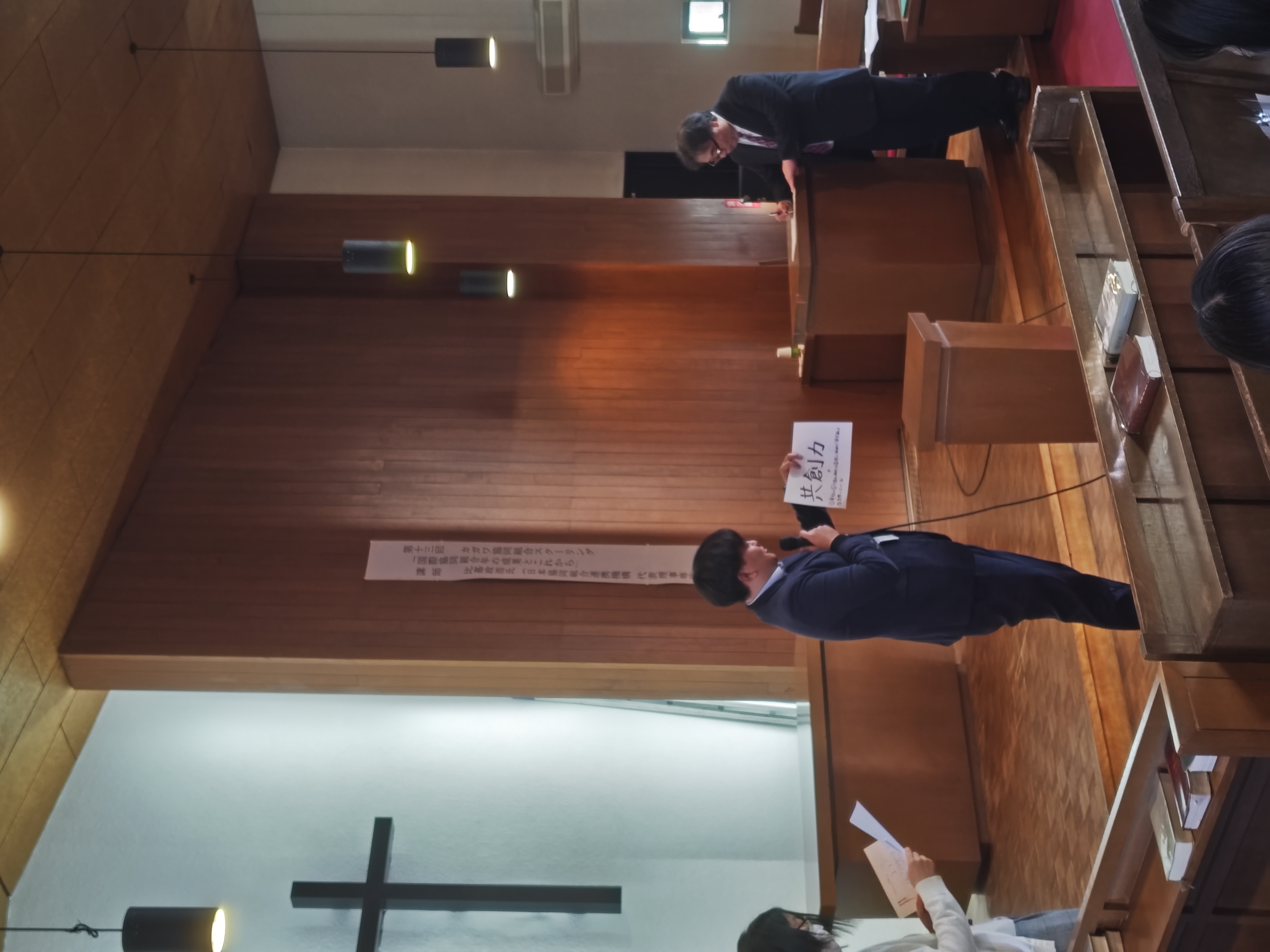 午後は法政大学の伊丹教授のご指導の下、9グループに分かれてグループディスカッションと全体発表を行いました。「いま必要なのは賀川豊彦の○○力」「協同組合の魅力を伝えるフレーズ」「各協同組合の課題と今後の連携」などといった、賀川と協同組合をテーマに様々な課題でグループディスカッションが行われました。会場移動後は9グループで順番に全体発表が行われ、「いま必要な賀川豊彦の○○力」では、賀川の「利他的行動力」「共創力」「社会投資力」「飛び込み力」「自己犠牲のない挑戦力」などが必要との発表があり、「協同組合の魅力を伝えるフレーズ」では、「(協同組合は)最高のサッカースタジアム」「それ!協同活動です」「あなたが主役 私も主役 みんなで主役」などの発表がありました。「各協同組合の課題と今後の連携」では、協同組合の連携強化として「全国共通協同組合カードの作成」「協同組合モールの創設」などといった発表がありました。ここでは書ききれないほどの素晴らしく興味深い発表が多く、楽しく真剣に皆様が考えていただいたのが非常によく伝わりました。